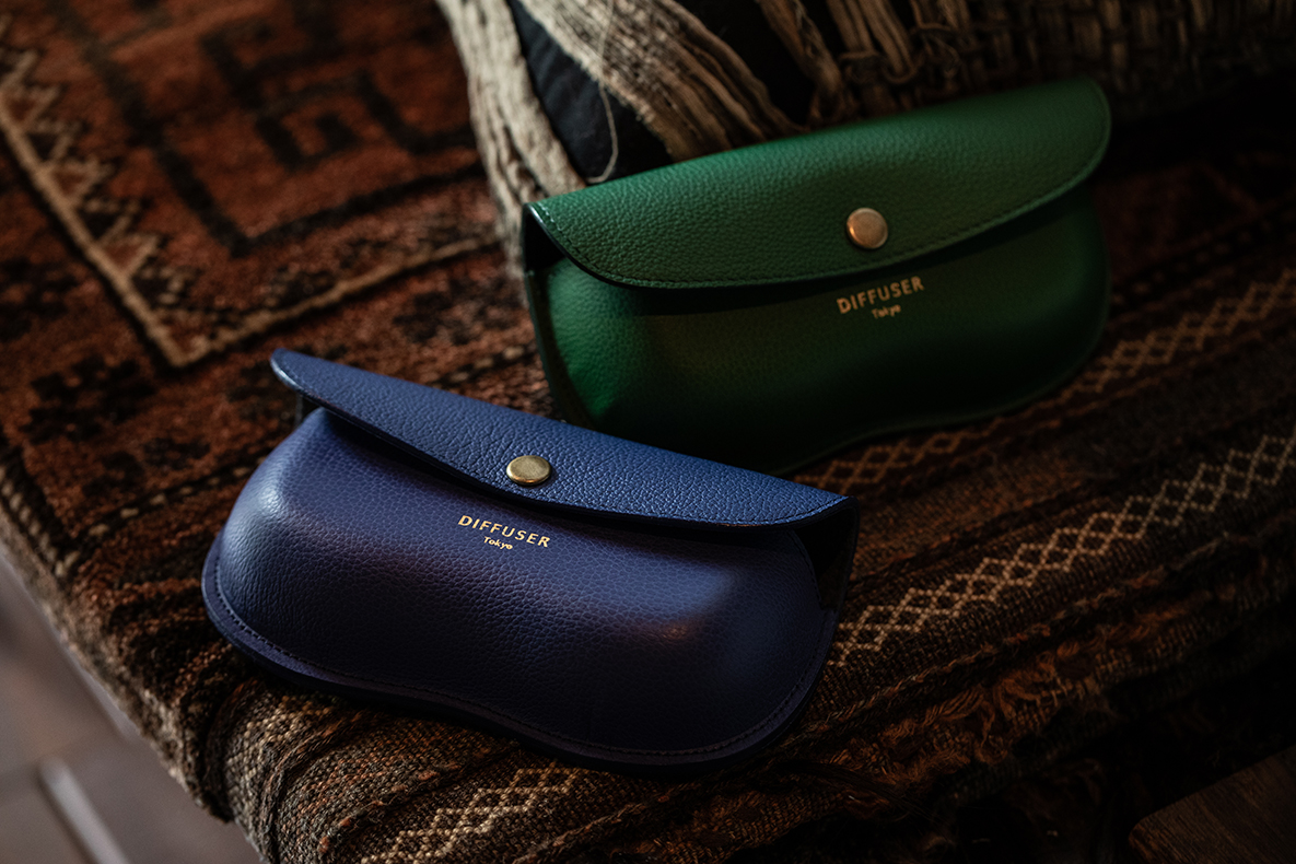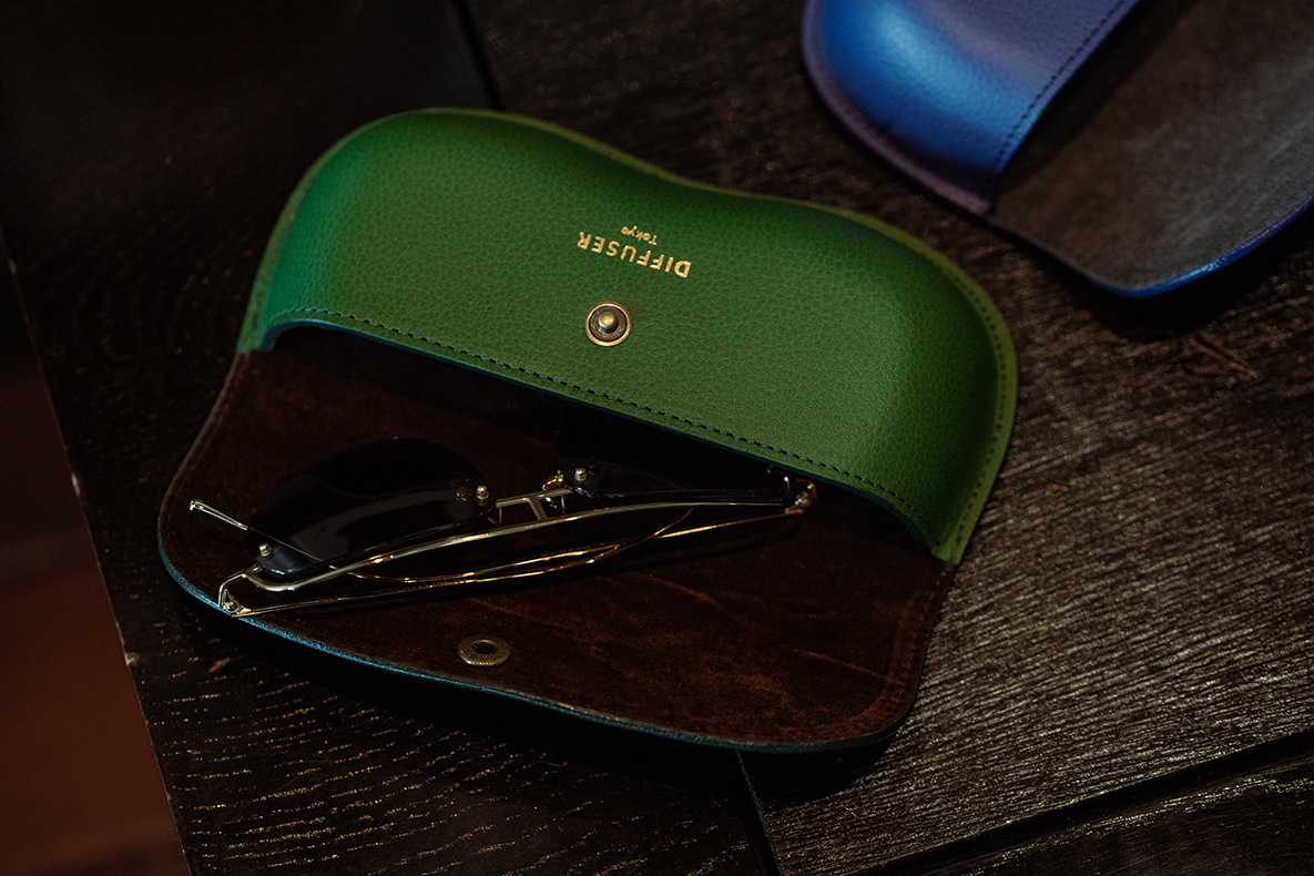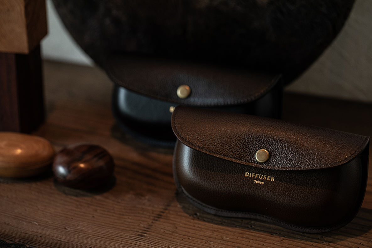 An eyewear case that can be attached to a belt. The wet-forming technique involves fitting wetted leather into a wooden mold and applying pressure for several days to create a three-dimensional shape, and it is said to be difficult to achieve a large three-dimensional effect. The high level of skill of skilled craftsmen has enabled the creation of a deep gusset, and the case is designed to be just firm enough to protect the eyewear stored inside. There is a belt loop on the back of the case, so it can be attached to a pants belt or shoulder bag strap.