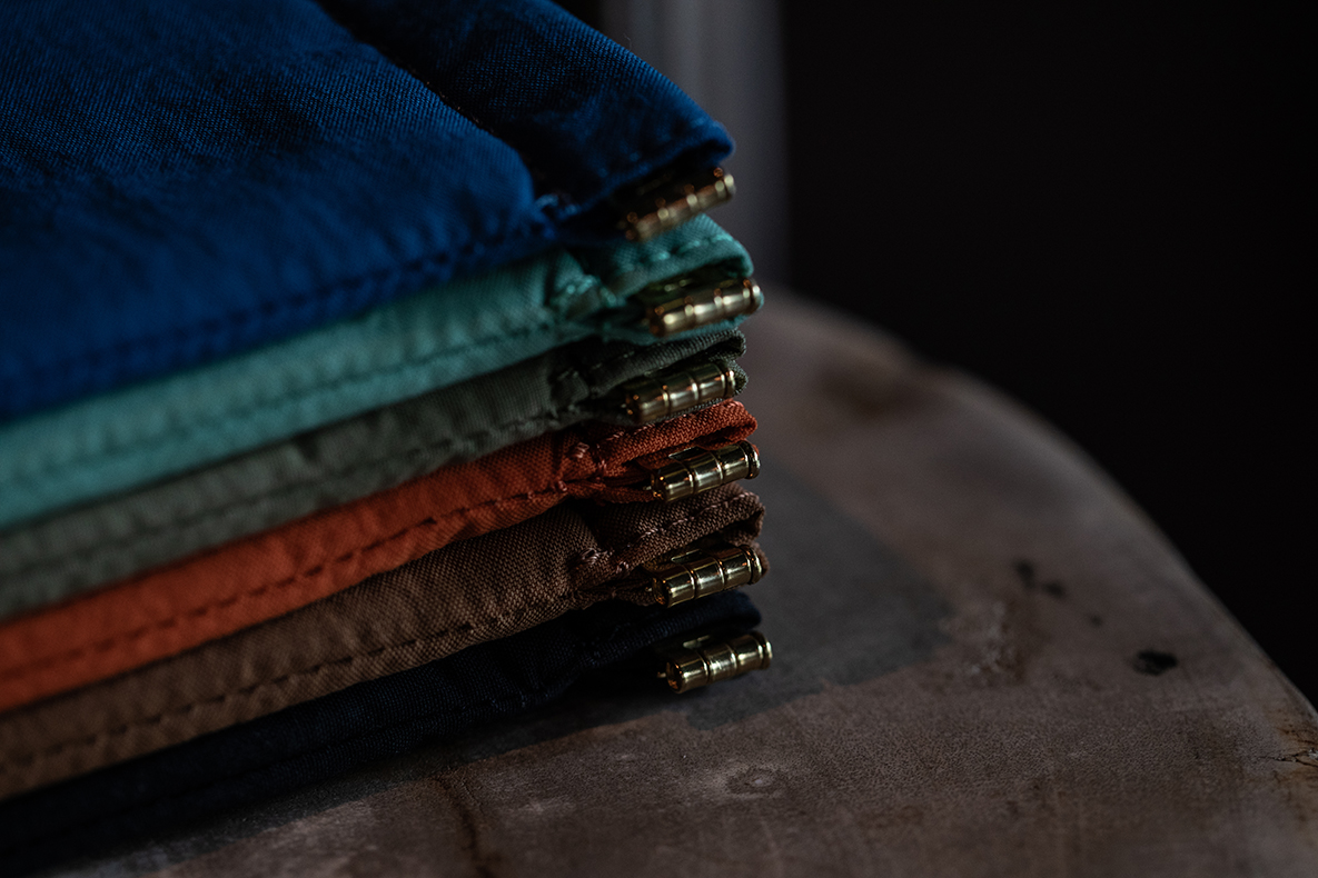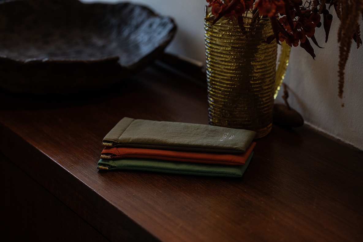 Nylon eyewear with a natural feel. This case is made from Komatsu Seiren’s “ONIBEGIE,” a Taslan nylon with a natural cotton-like texture dyed with an original blend of quercetin extracted from onion skins and other natural pigments. A thick cushioning material is sandwiched between the lining and outer fabric, protecting the stored eyewear from external pressure.