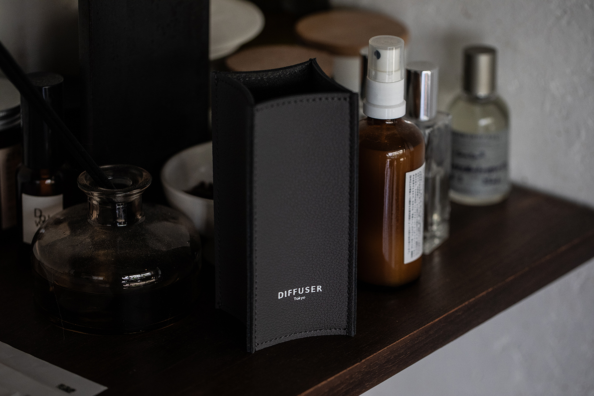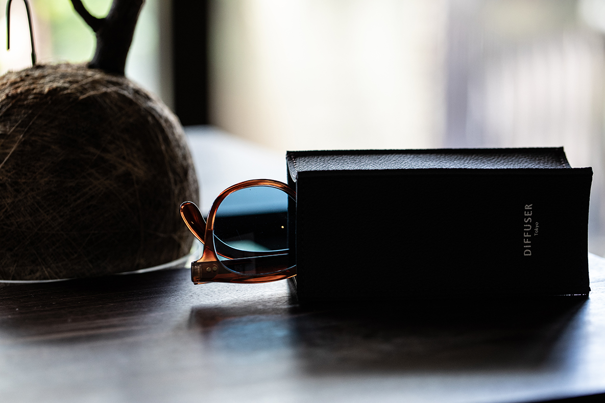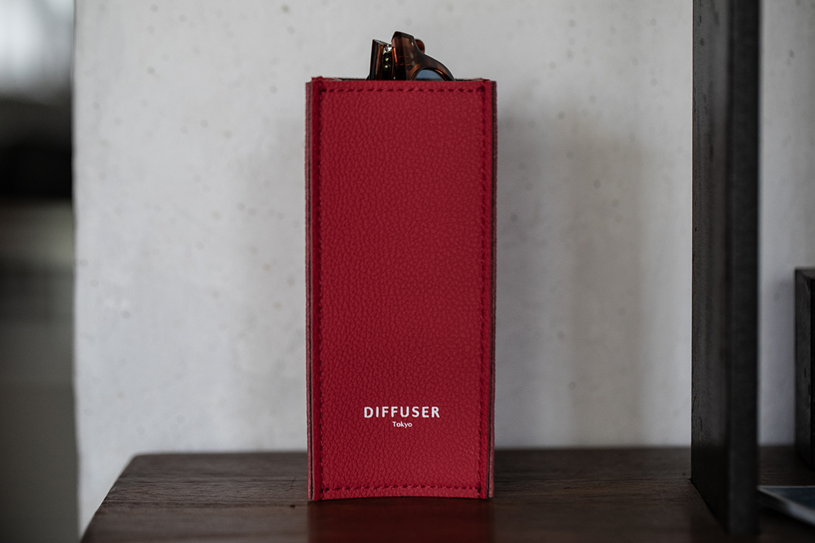 The recycled leather eyewear stand. Recycled leather is a recycled material made by crushing and reprocessing leather scraps and offcuts generated during the leather manufacturing process into sheets. This eyewear stand is made from high-quality recycled leather, selected for its high texture. It is heavier and more stable than eyewear stands made solely from leather.